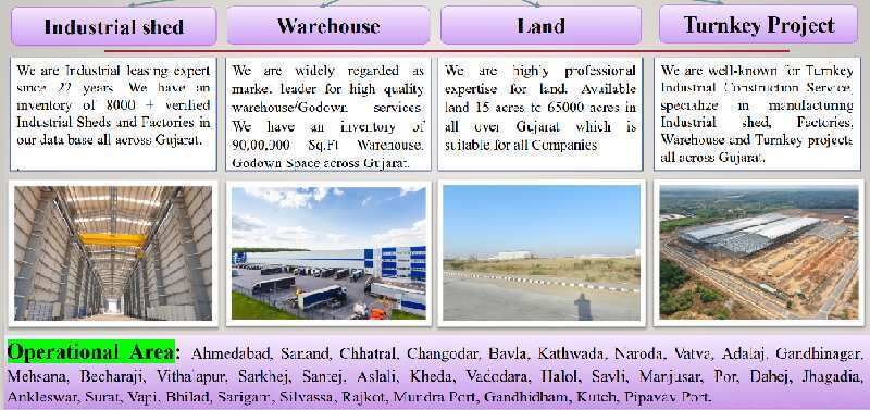 AVAILABLE INDUSTRIAL & AGRICULTURE LAND / INDUSTRIAL SHED WITH AVAILABILITY OF ALL FACILITIES. AVAILABLE LAND 30 ACRES TO 65000 ACRES AREA IN NARODA / ASLALI / SANAND / CHANGODAR / BAWLA / KHEDA / CHATRAL / ALL AHMEDABAD / VADODARA / ALL OVER GUJARAT. SUITABLE FOR MNC COMPANY/ ENGINEERING / AUTOMOBOLE / ELECTRONIC / PHARMACEUTICALS / FOOD / GARMENT, ETC.
